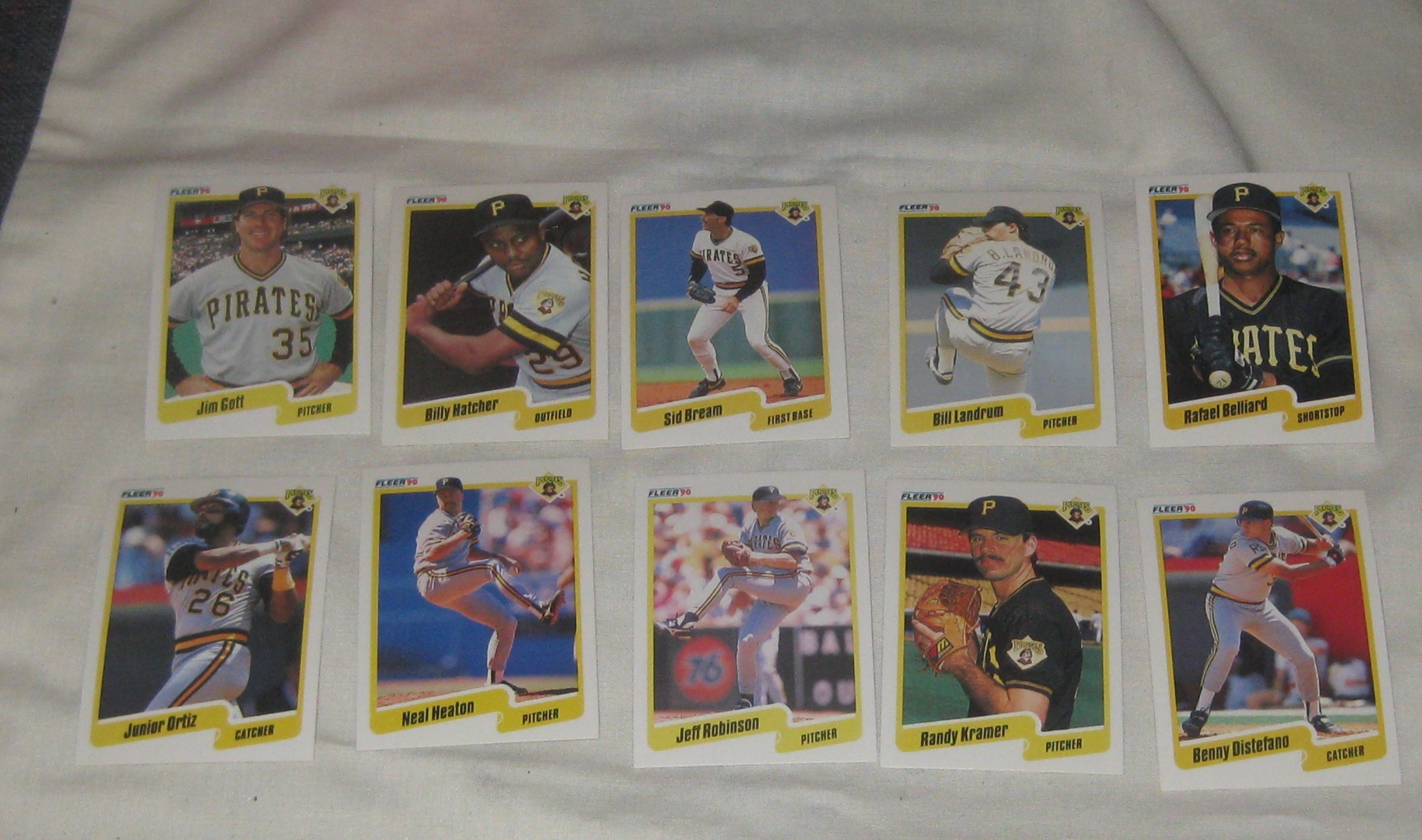This listing is for 10 different Pittsburgh Pirate players in 1990. The players included are: Rafael Belliard, Bill Landrum, Sid Bream, Billy Hatcher, Jim Gott, Benny Distefano, Randy Kramer, Jeff Robinson, Neal Heaton, Junior Ortiz,. The cards are loose and all for just three dollars.