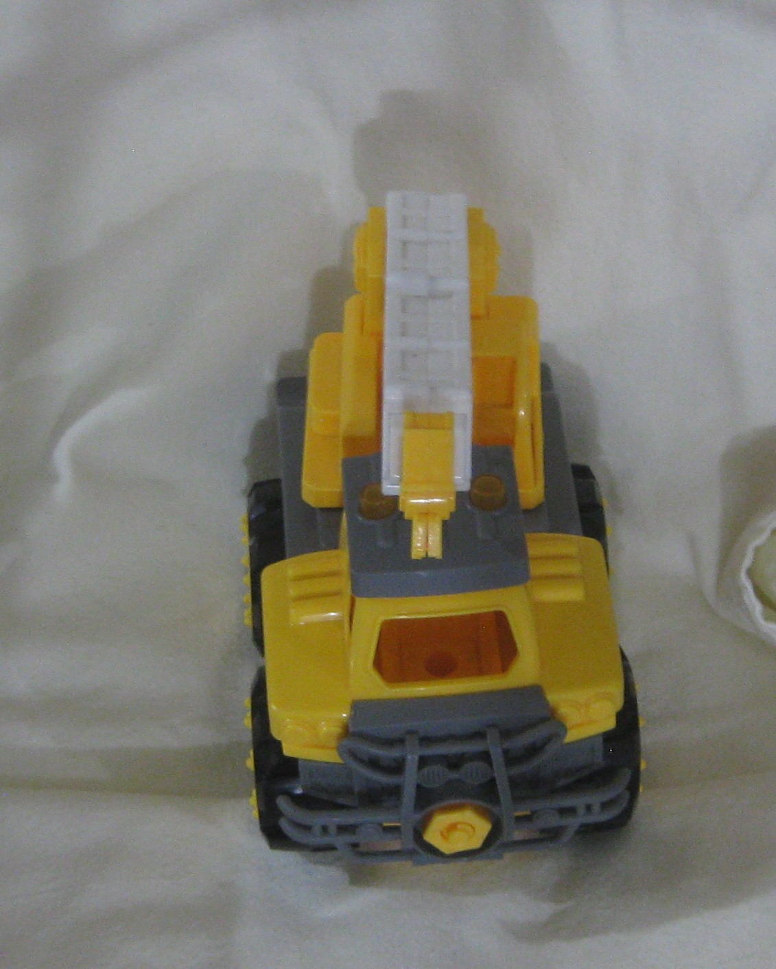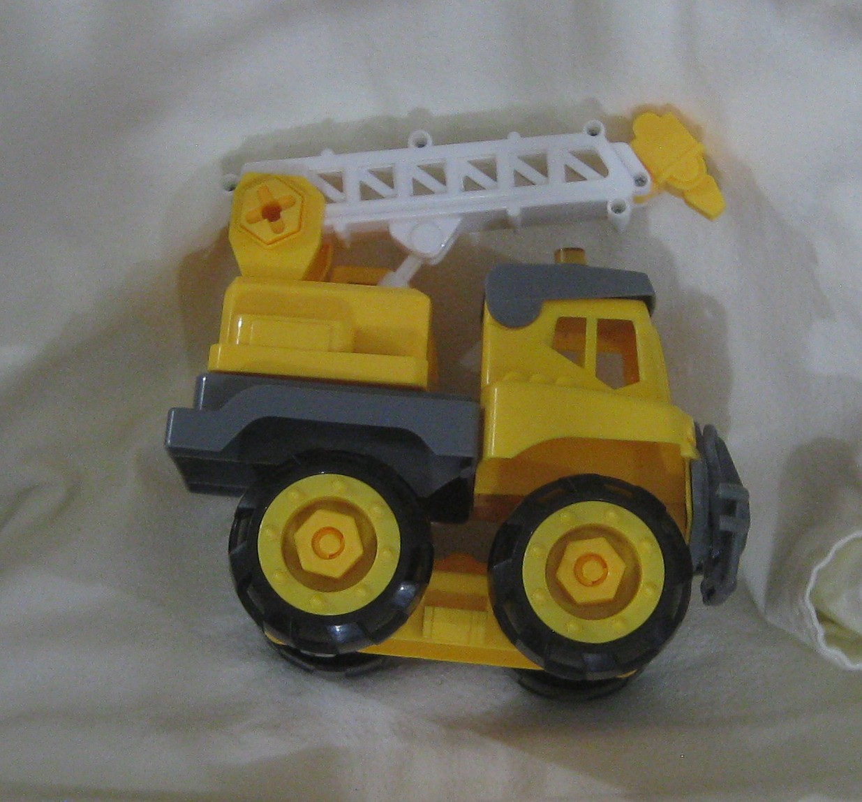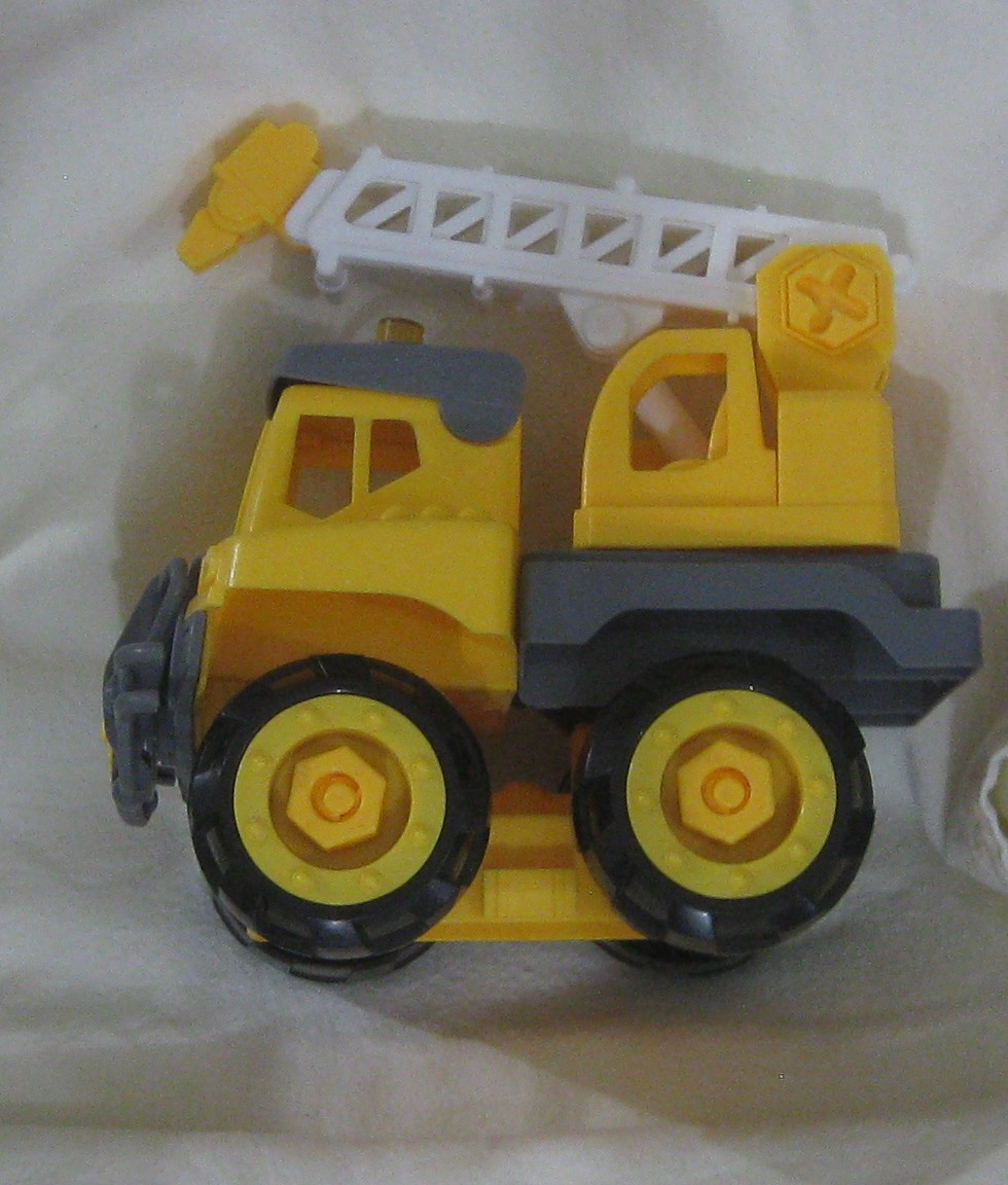 this yellow truck helps kids develop tool ability. it is put together with plastic bolts and kids can use a real socket to take apart and put it back together. no socket or tool included.